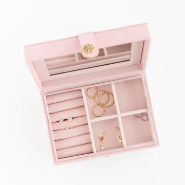 The Pip Pop Post Jewelry Box - the perfect combo of style and organization for your Pip Pop collection! Comes in ballet pink vegan leather, a glistening gold flower snap and embossed Pip Pop logo. Inside - the softest pink velvet earring cushions, specialized compartments for earring backs and hoops, and a mirror for try-ons! You'll never have to search for your earrings or extra backs again!